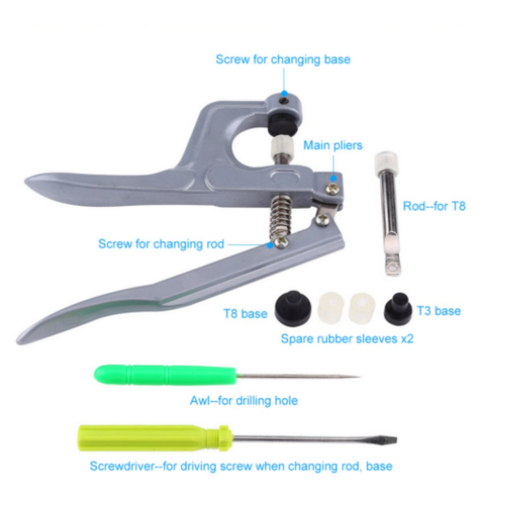 The set of items includes on professional fastener snap pliers, 150pcs T5 12mm plastic Buttons.