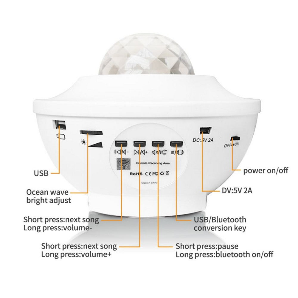 2 In 1 Remote Control Speaker LED Ocean Wave Night Light Star Projector Sound Motion Sensor Lamp White
