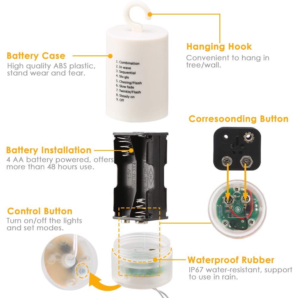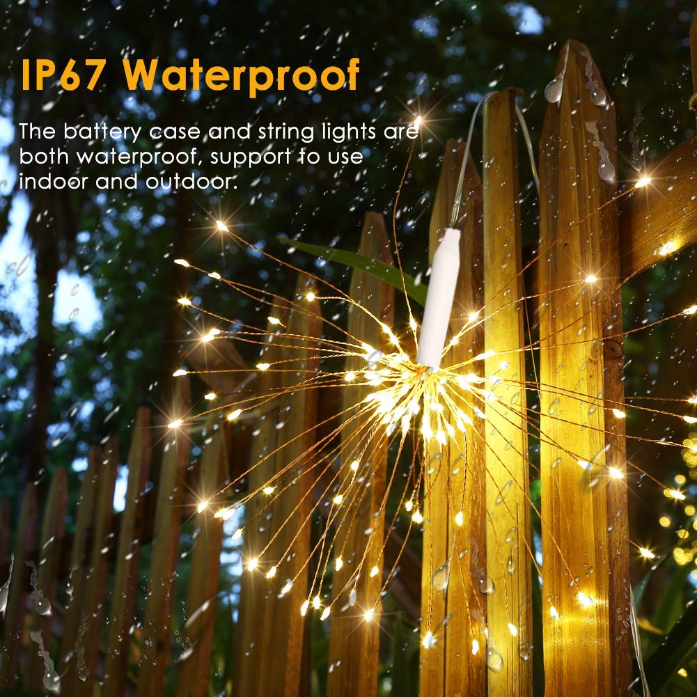ENERGY EFFICIENT&OUTDOOR WATERPROOF LIGHT: Due to the battery operated Fireworks Light is IP65 waterproof, so it also can be used for outdoor decoration.They can work excellently even on rainy days.And it is safe and not easy to heat after a long time use.no socket required, no risk of electric shock. The process is not hot and low energy consumption; But please do not immerse the battery case in water.