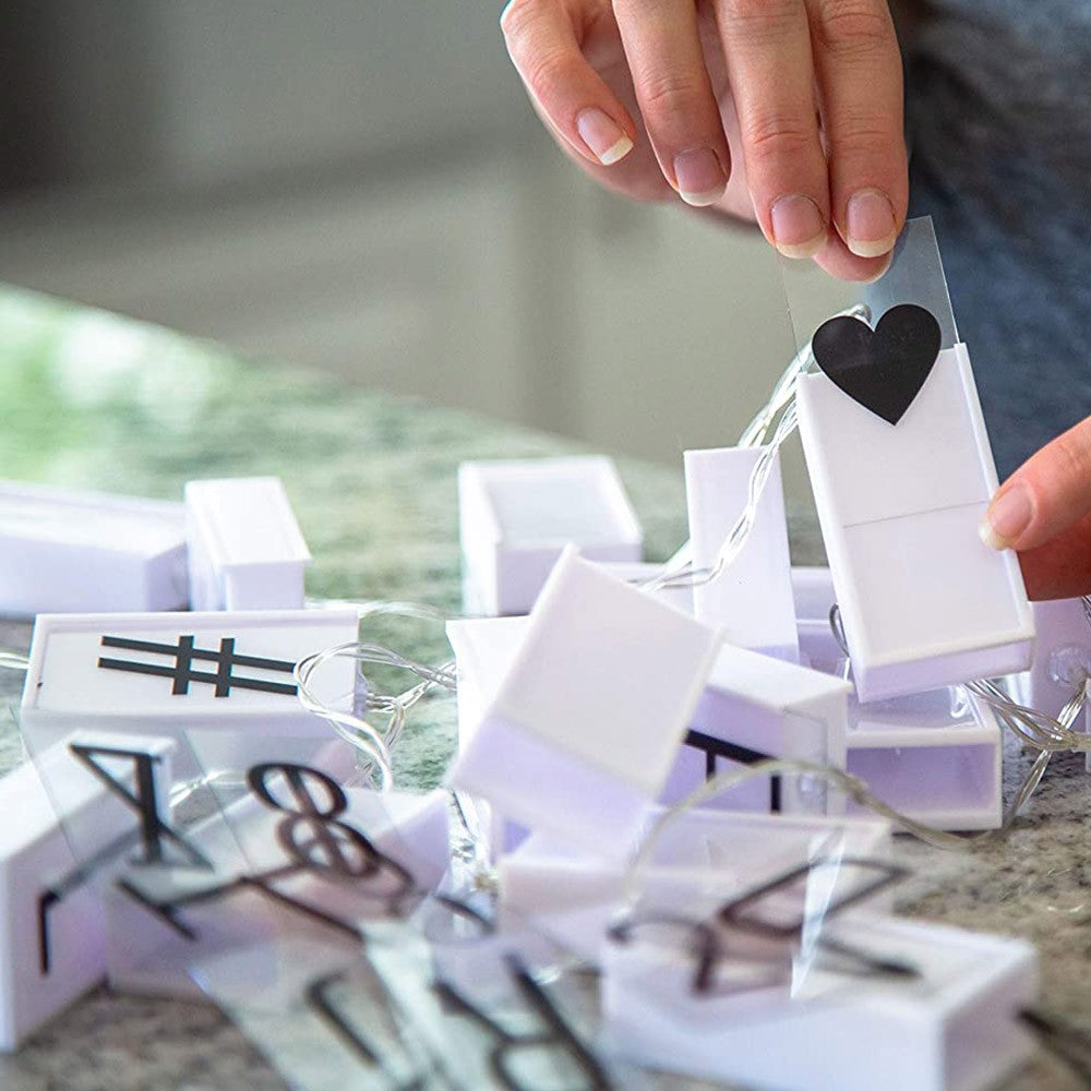 CHANGEABLE LETTERS: Create your own messages with these LED fairy lights. You’ll get a set of plastic slides, each featuring different letters and symbols. Interchange them to create messages, quotes, phrases, and words. With the whole range of the alphabet, the possibilities are endless! Express yourself using these fun light-up letter boxes.GREAT FOR PARTIES: For certain parties, you need to share specific messages. With our customizable string of lights, you can share with your loved ones your unique feelings. Say “Happy Birthday,” “Merry Christmas,” and more! Just insert the plastic slides into the cartridge to create your own special messages. It’s that simple!CUTE ROOM DECOR: Spruce up your space using these decorative string lights. They’ll look absolutely darling in a teenager’s bedroom or college students dorm. You can also use them as lighting for your living room. These lights eliminate the need to purchase different signs to hang in your room — create your own messages instead!HANG ANYWHERE: The beauty of these hanging lights includes the fact that they can be strung in any space. You can hang them outdoors or indoors. Adorn your desk or counter with them. Hang them up around your RV or camper for added charm and charisma. String them up along your balcony, patio, or porch to help set the mood you want.BATTERY-OPERATED: There’s no need to find an outlet to plug in these lights because they are conveniently battery operated. Just flip the switch and they’ll light up! These lights are easier than ever for you to hang because you will no longer need to search for an extension cord.Material: premium PVCLight box quantity: 20Each light box size: 3.5x6.5cmLight string length: 2MCard Quantity: 96PCS3 x AA battery (batteries not included)Package Content: 1x light