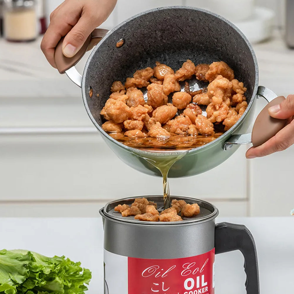 The separated fine mesh strainer effectively separates debris from the oil, ensuring clean and clear cooking oil.