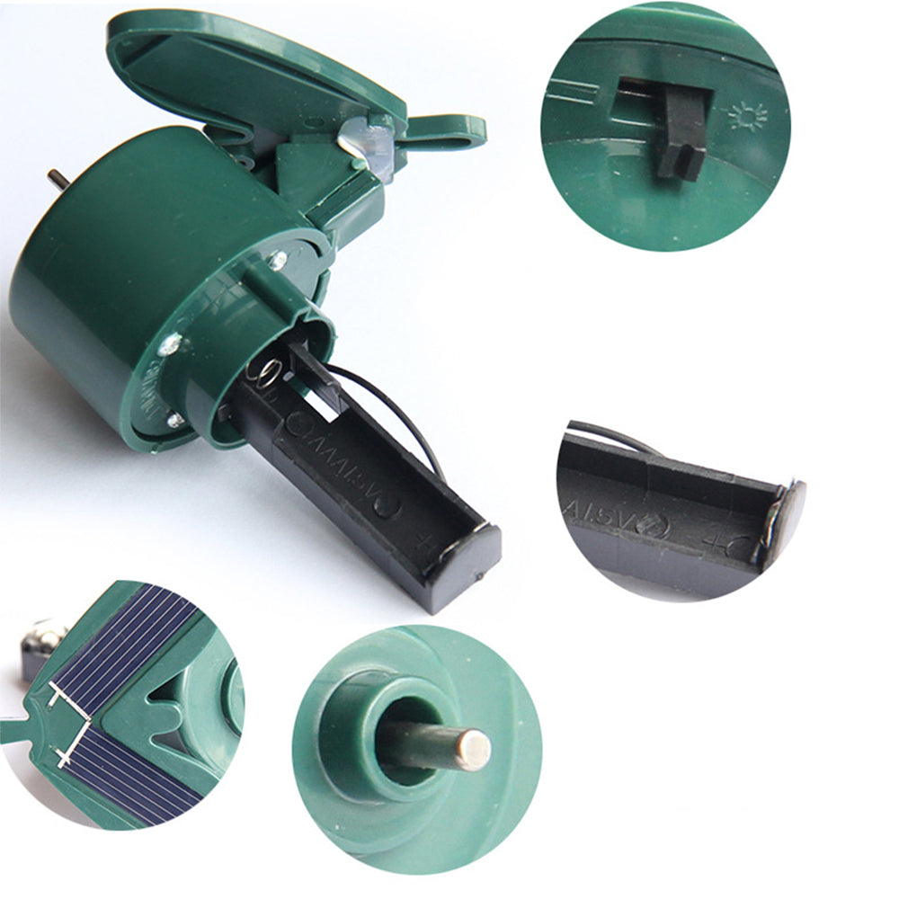 Powered by a small solar panel that converts sunlight into energy, enabling the humming bird to fly. When the weather turns dark, you can switch to the backup AAA battery (not included).