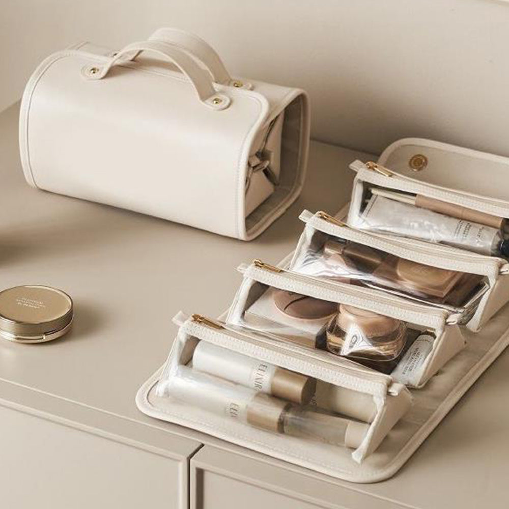 The interior contains 4 detachable separate pouches to store your makeup and toiletries in separate sections, while also allowing you to separate wet and dry items.
