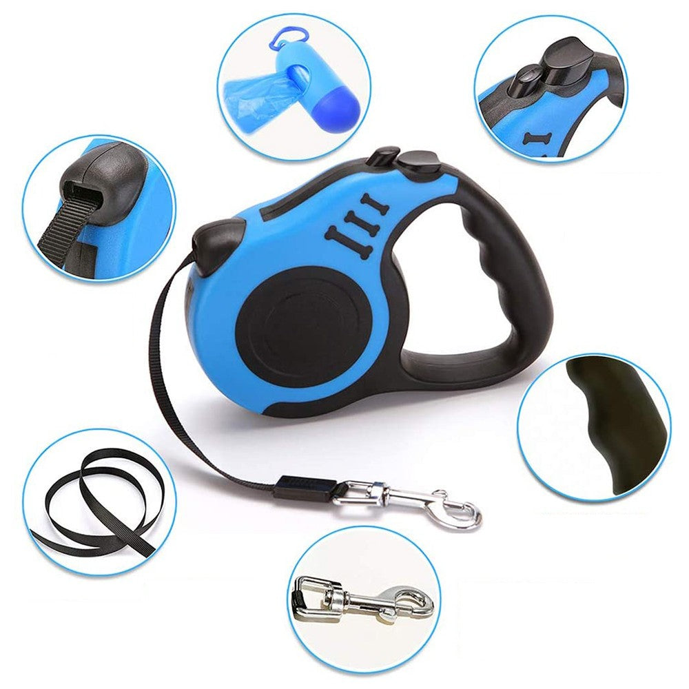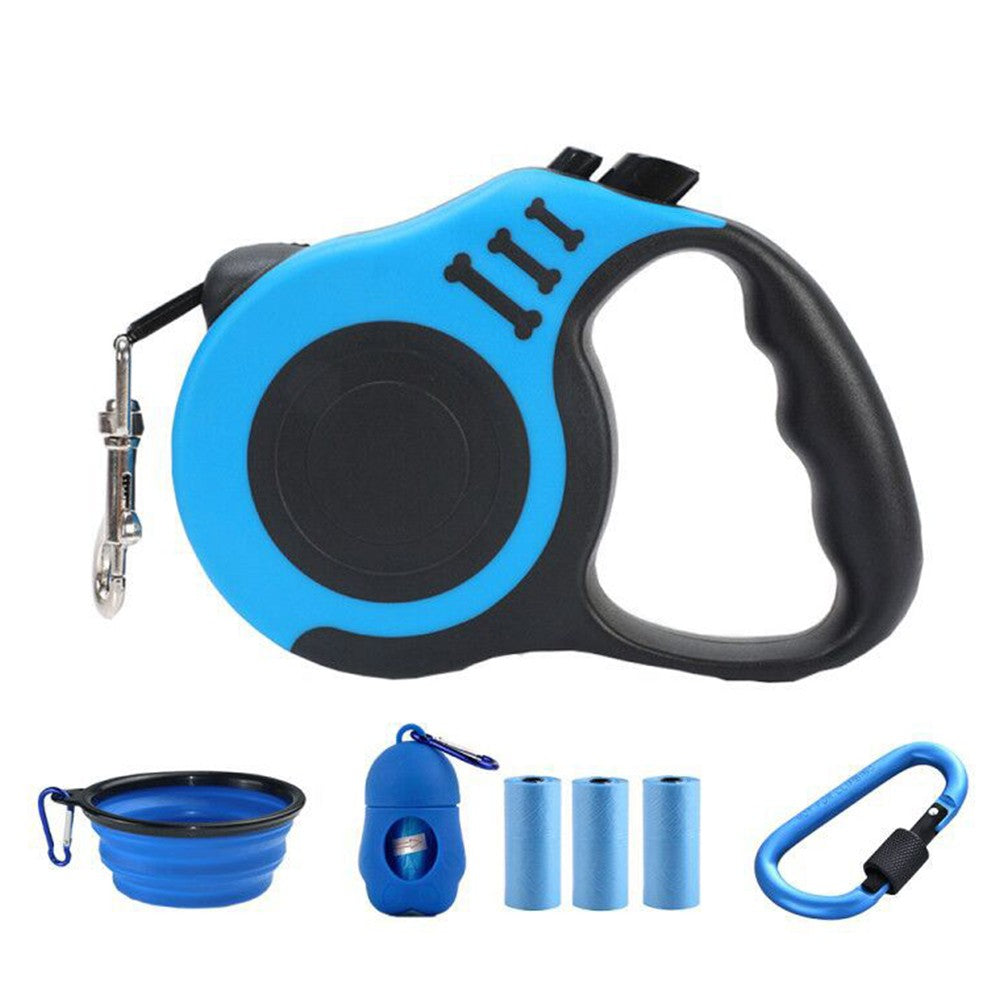5m Retractable Nylon Dog Training Leash with Folding Bowl Waste Bag Dispenser Blue
