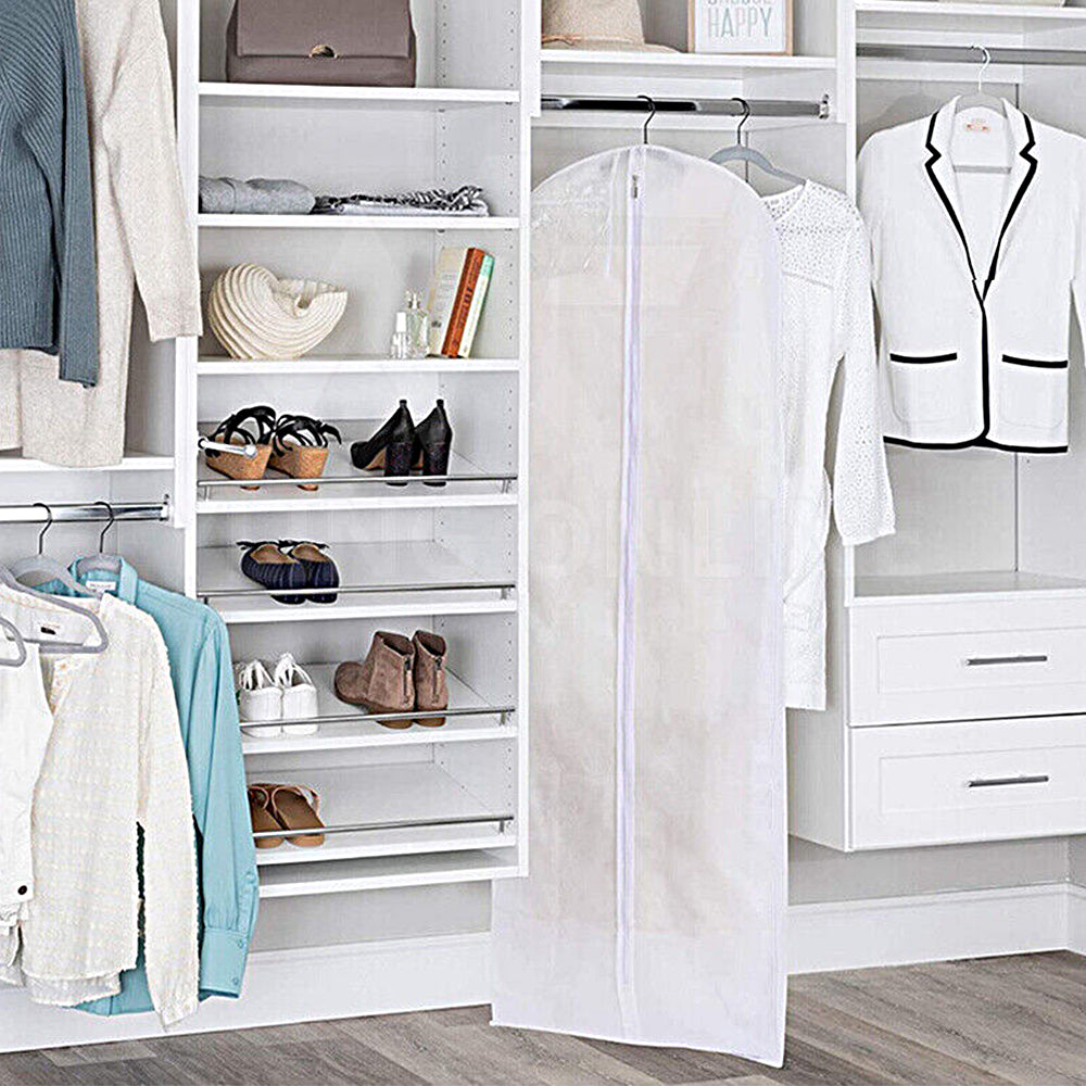Keep bridal wedding dress and other gown garment clean and crease-free while they are hanging in a wardrobe with this generously-sized clothes cover.