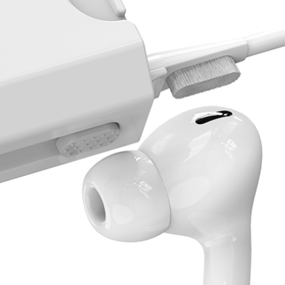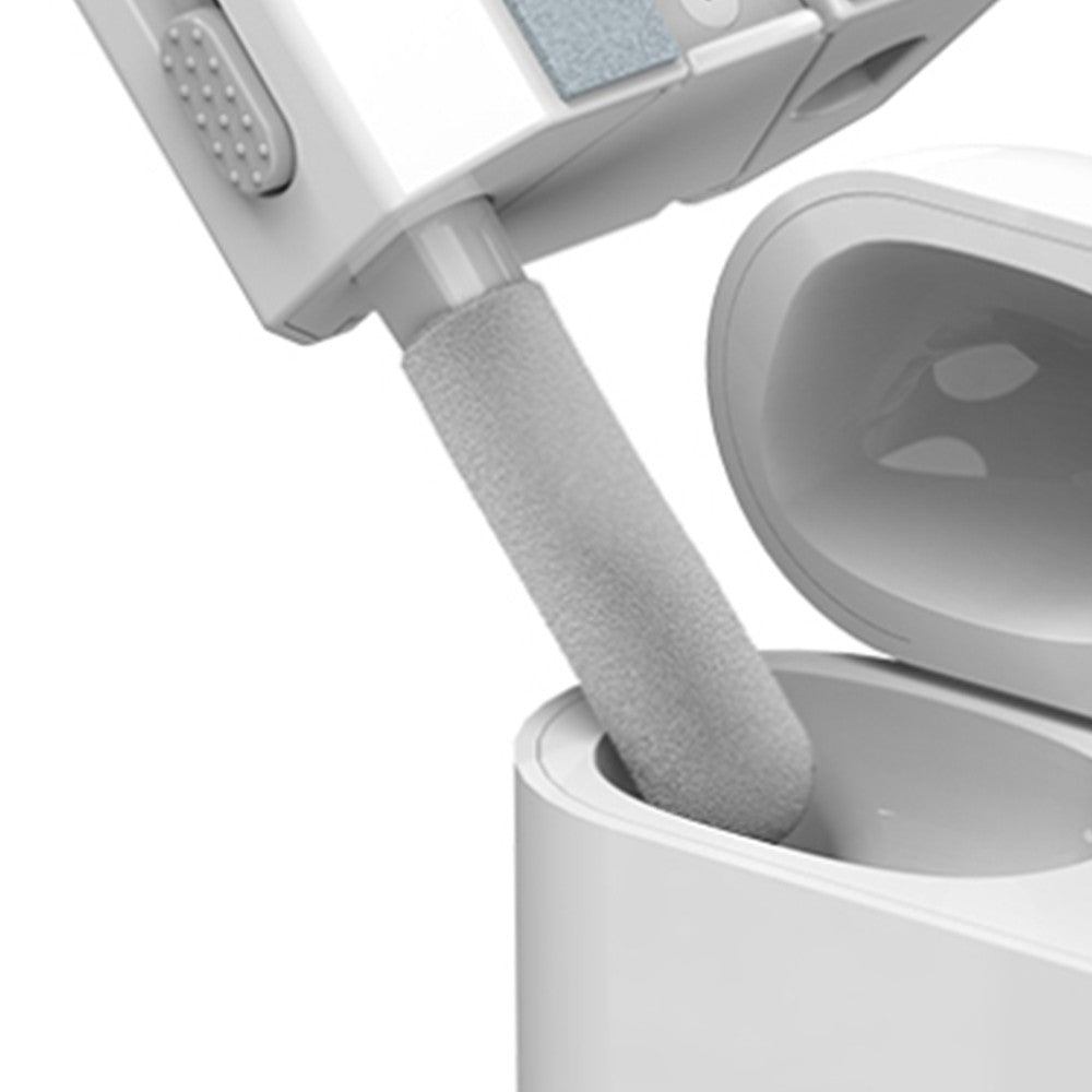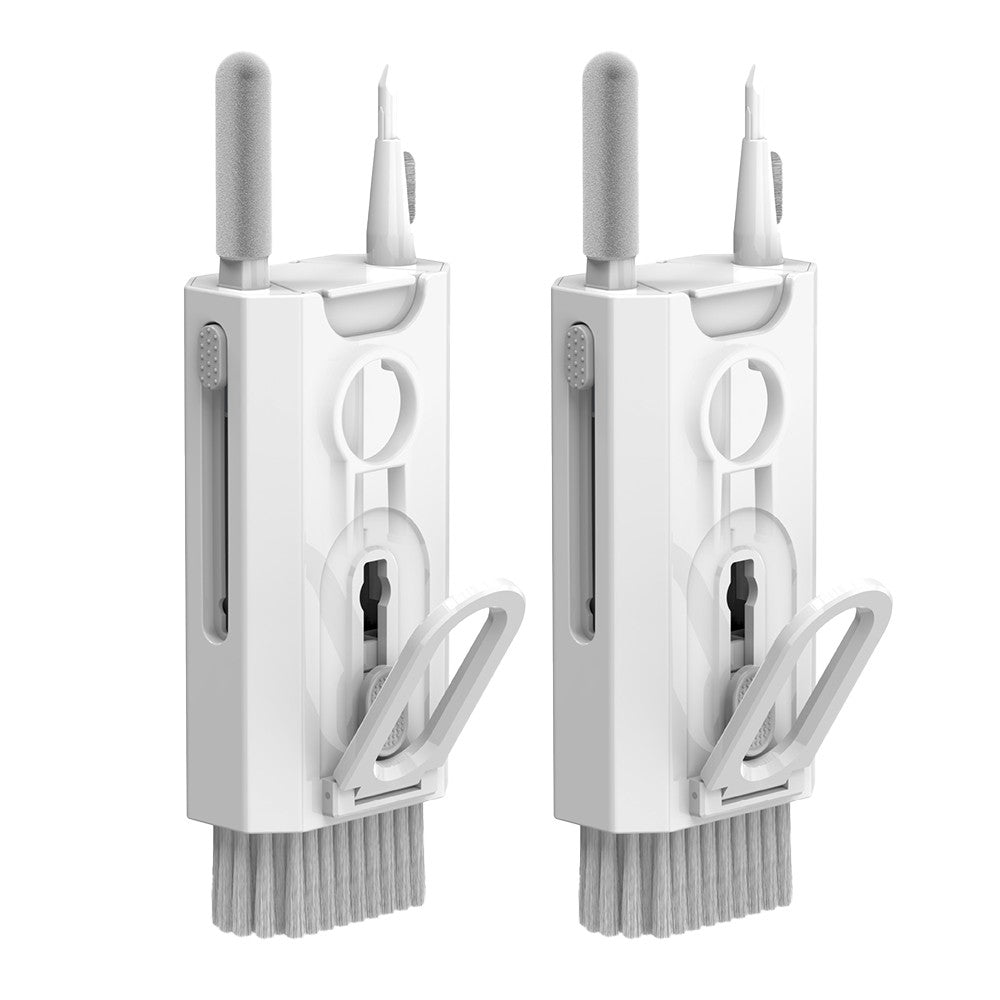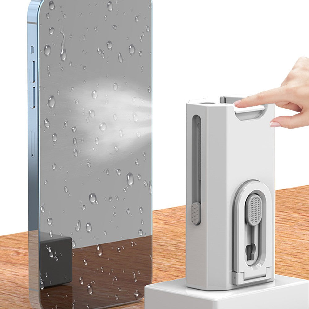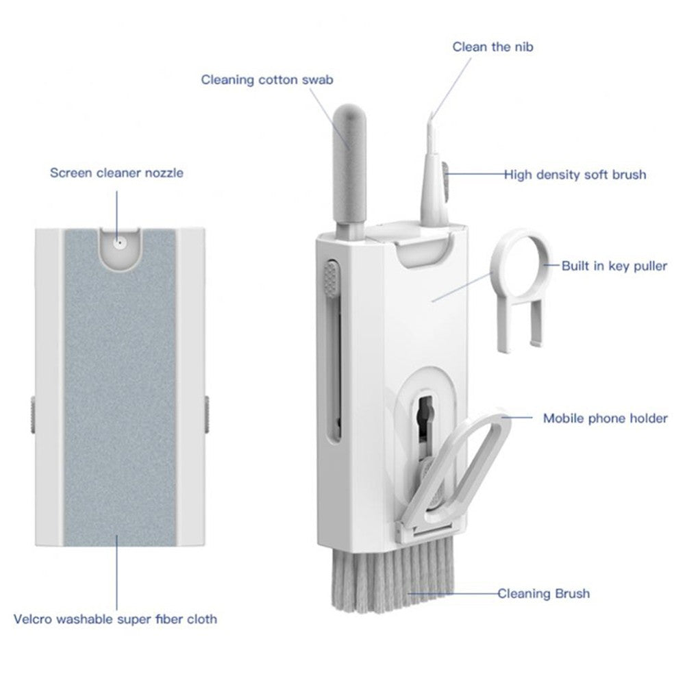 A set contains 8 cleaning tools: 1 high-density soft brush, 1 fiber cloth, 1 screen cleaner nozzle, 1 cleaning cotton swab, 1 cleaning pen for headphones, 1 key cap puller, 1 mobile phone holder, 1 cleaning brush.