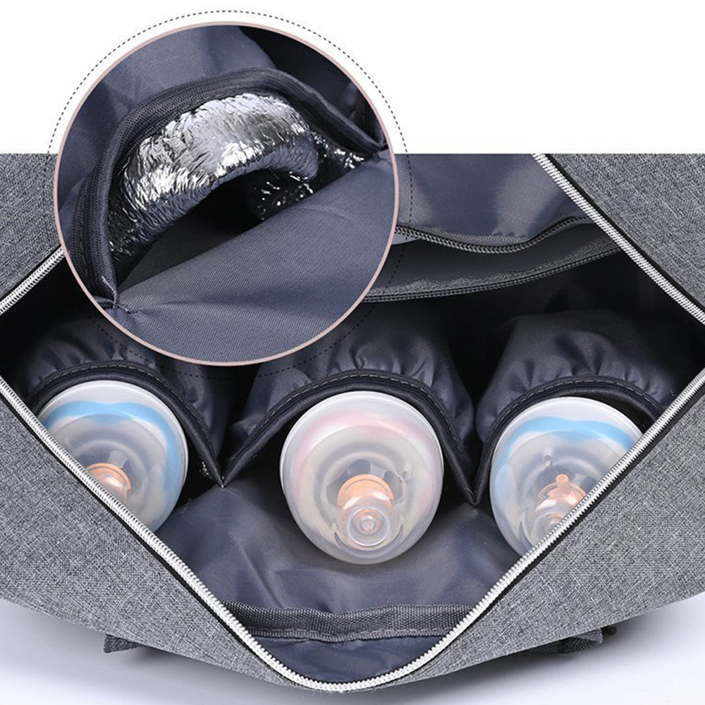 The maternity bag has one large zipped main compartment, which has 3 insulated pockets, the Insulated Aluminum foil inside provides insulation effect and can make your baby milk bottles keep warm.