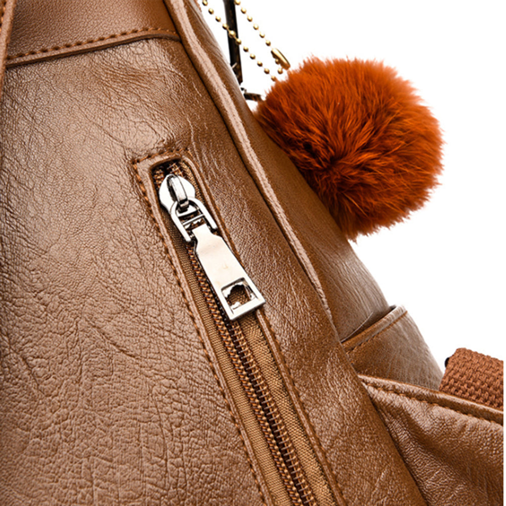 Women PU Leather Fluffy Ball Ornament Backpack Brown