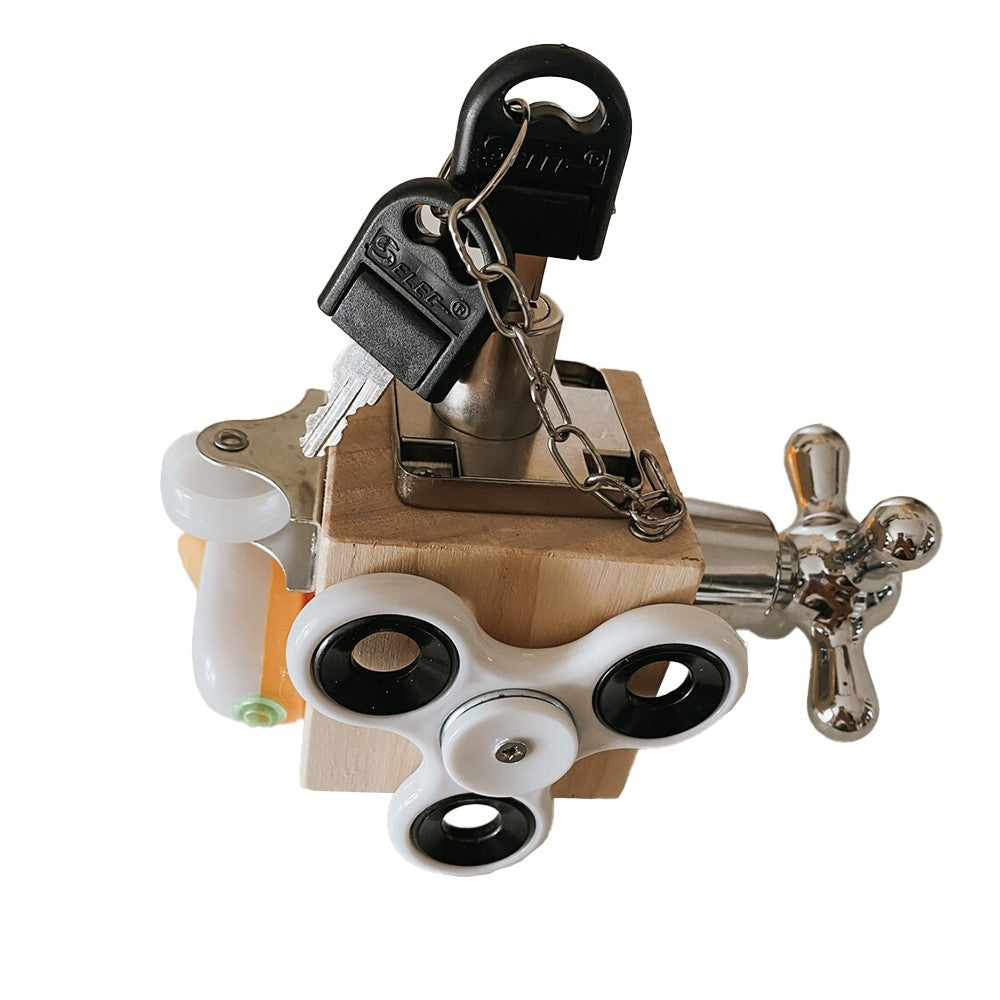 Wooden interactive toy has 6 sides, includes ingertip spiral, spring latch, one-way switch, universal wheel, faucet switch,rotating screw.