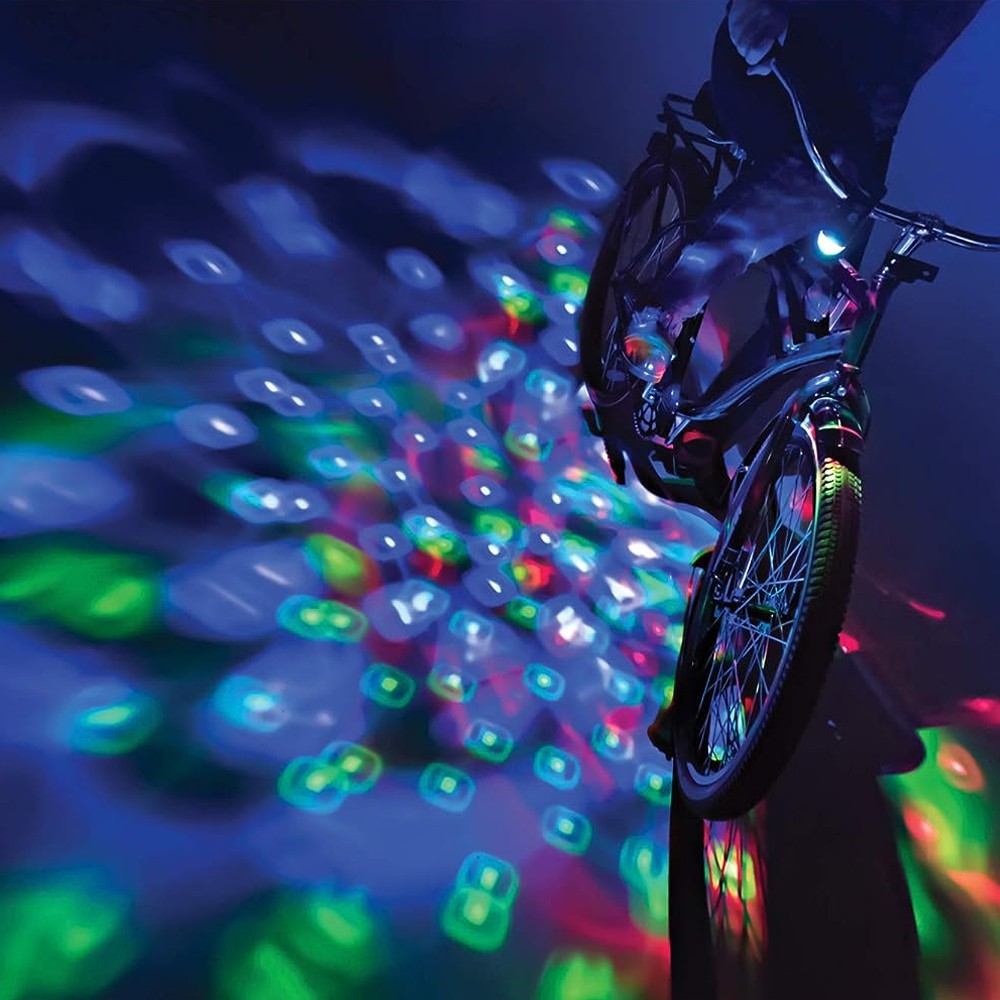 The LED bike light emit blinking red, blue and green lights that create a disco atmosphere while improving your visibility, is a fun bike light for night riding.
