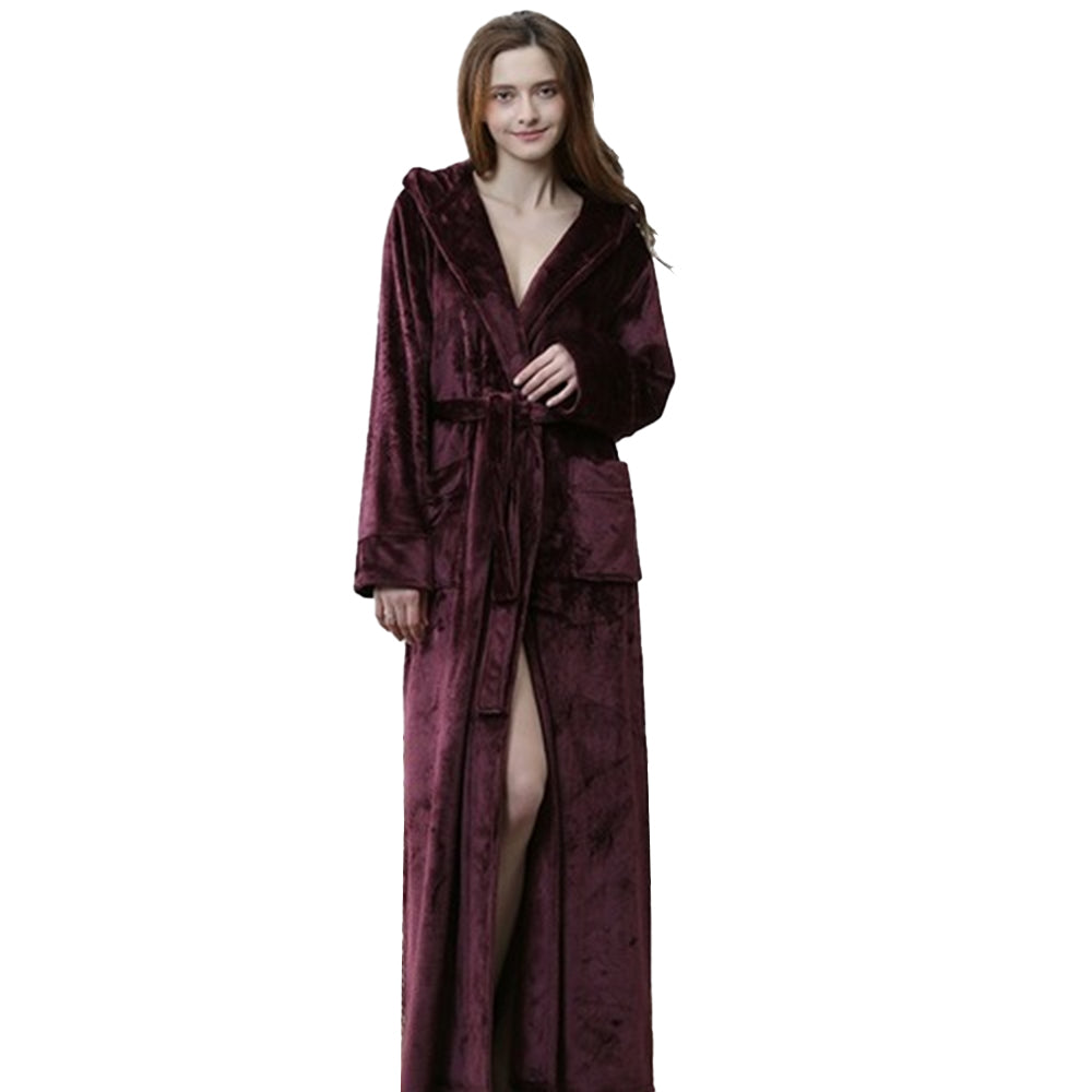 Winter Warm Flannel Hooded Fleece Long Bathrobe Lovers Sleepwear Dark Red