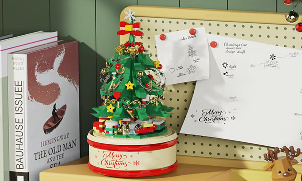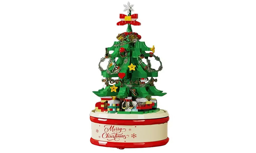 Festive Christmas tree building block set featuring LED lights and a music box, perfect for holiday decoration, interactive play, and family bonding.