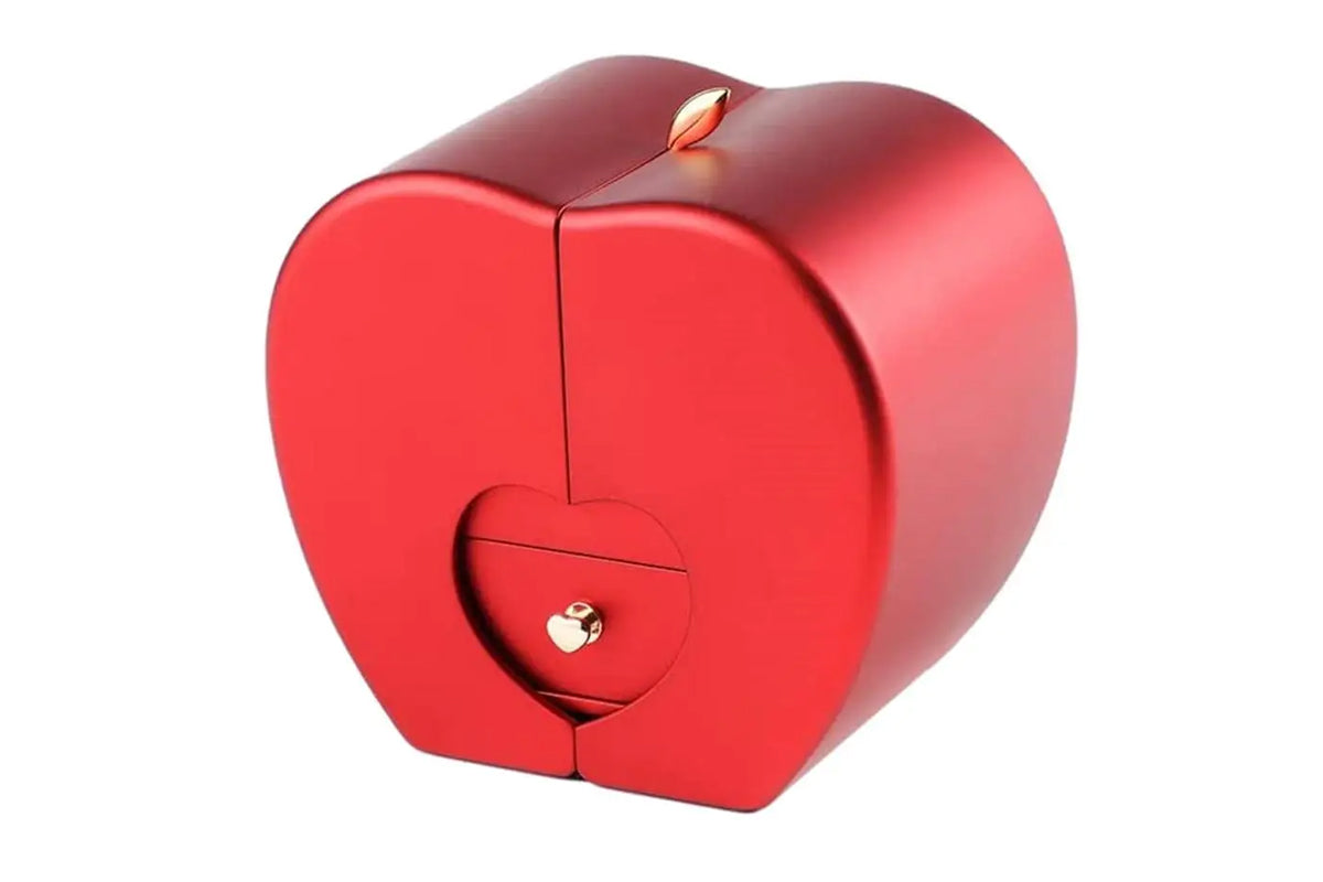 The necklace comes in an apple-shaped rose box with a jewelry compartment featuring drawers.