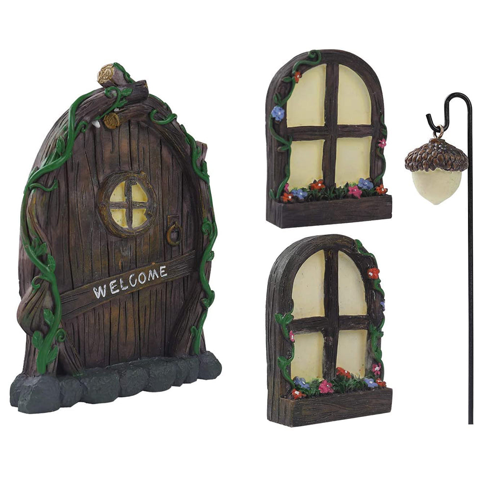 Miniature fairy garden gnomes door windows, made of premium resin, include 1 door, 2 windows, 1 lamp.