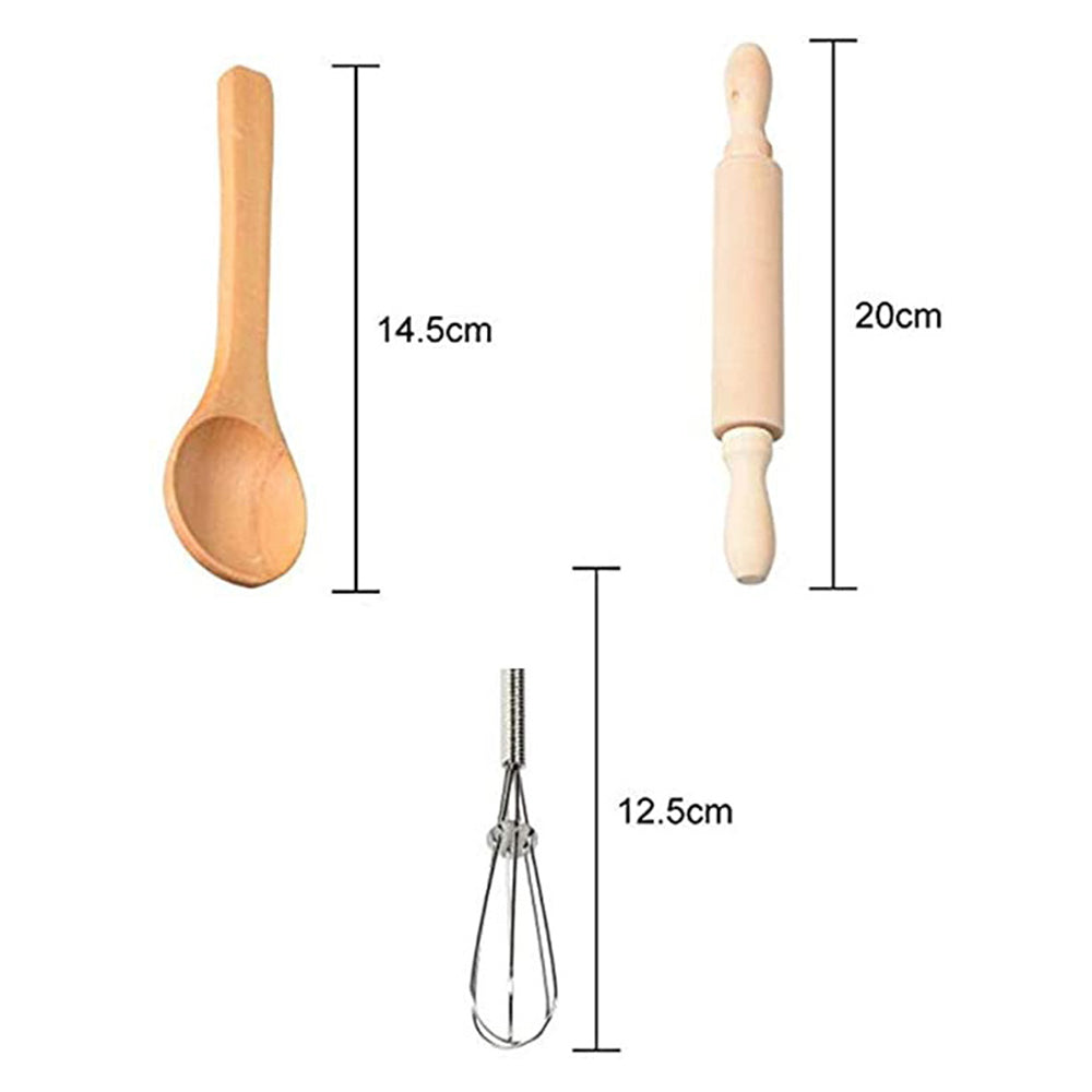 The simulated kitchen set includes apron, rolling pin, egg beater and mold, etc., which help to cultivate children's hands-on ability, intellectual development, visual sensitivity, etc.