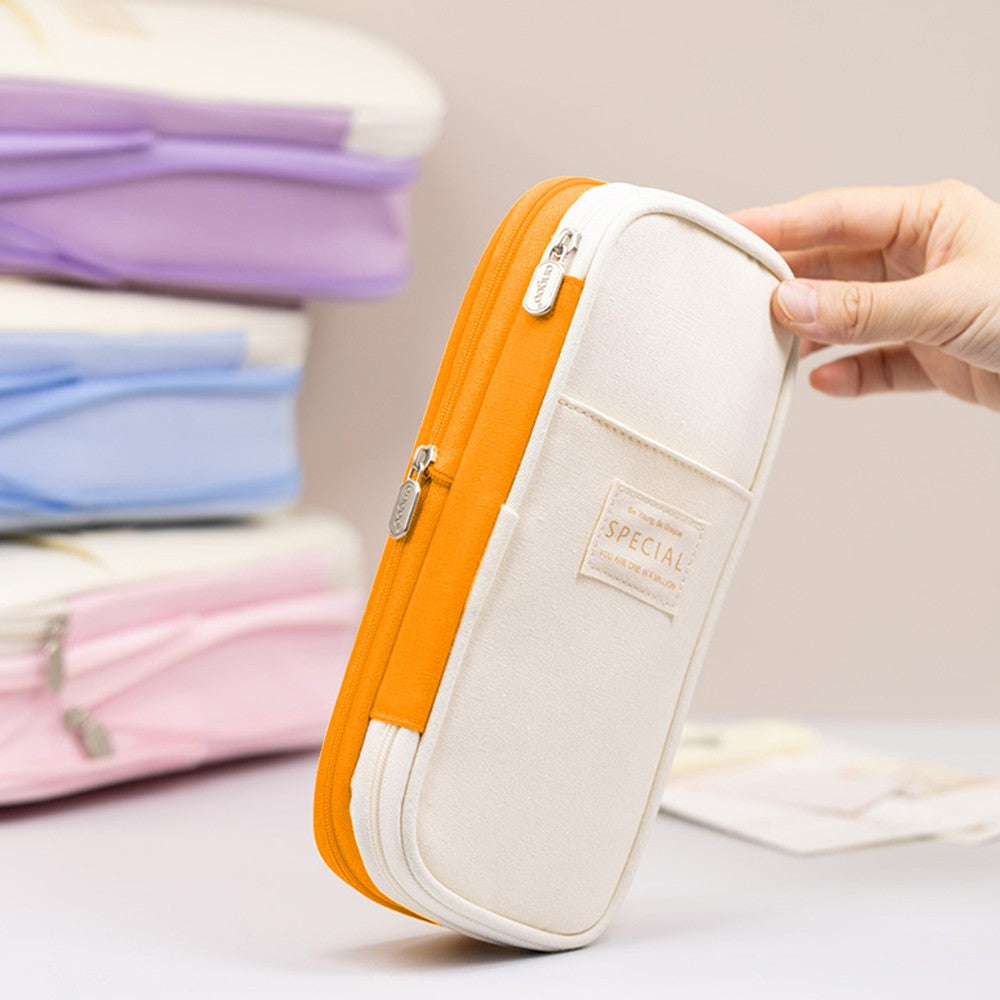 Due to the double zipper design, this pencil case can expand to store more pens and fold for easy storage.