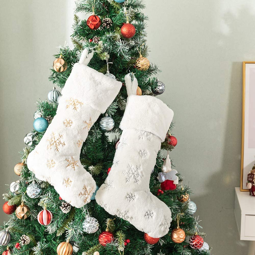 Plush christmas stocking very soft, perfect size for candies and various gifts. Add the perfect finishing touch to your Christmas tree with this tree skirt with sequin snowflakes.