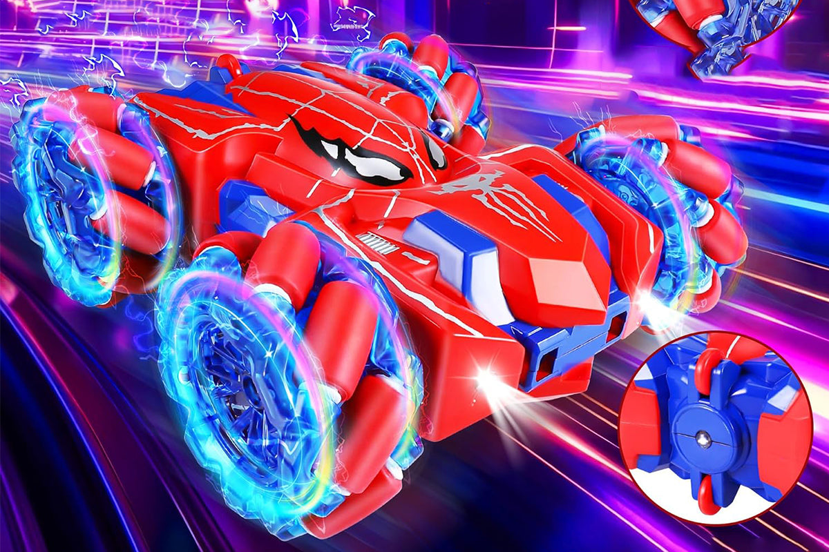 Designed with a unique spider-inspired look and dazzling LED-lit wheels, this high-performance stunt car captures kids' attention day or night.