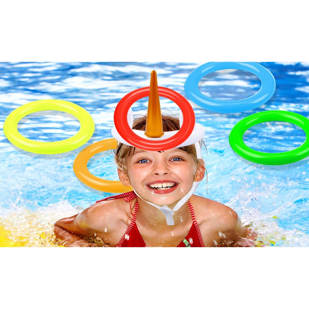 One person wears the inflated unicorn and others are tossing hoops onto the bunny ears or unicorn to hook them